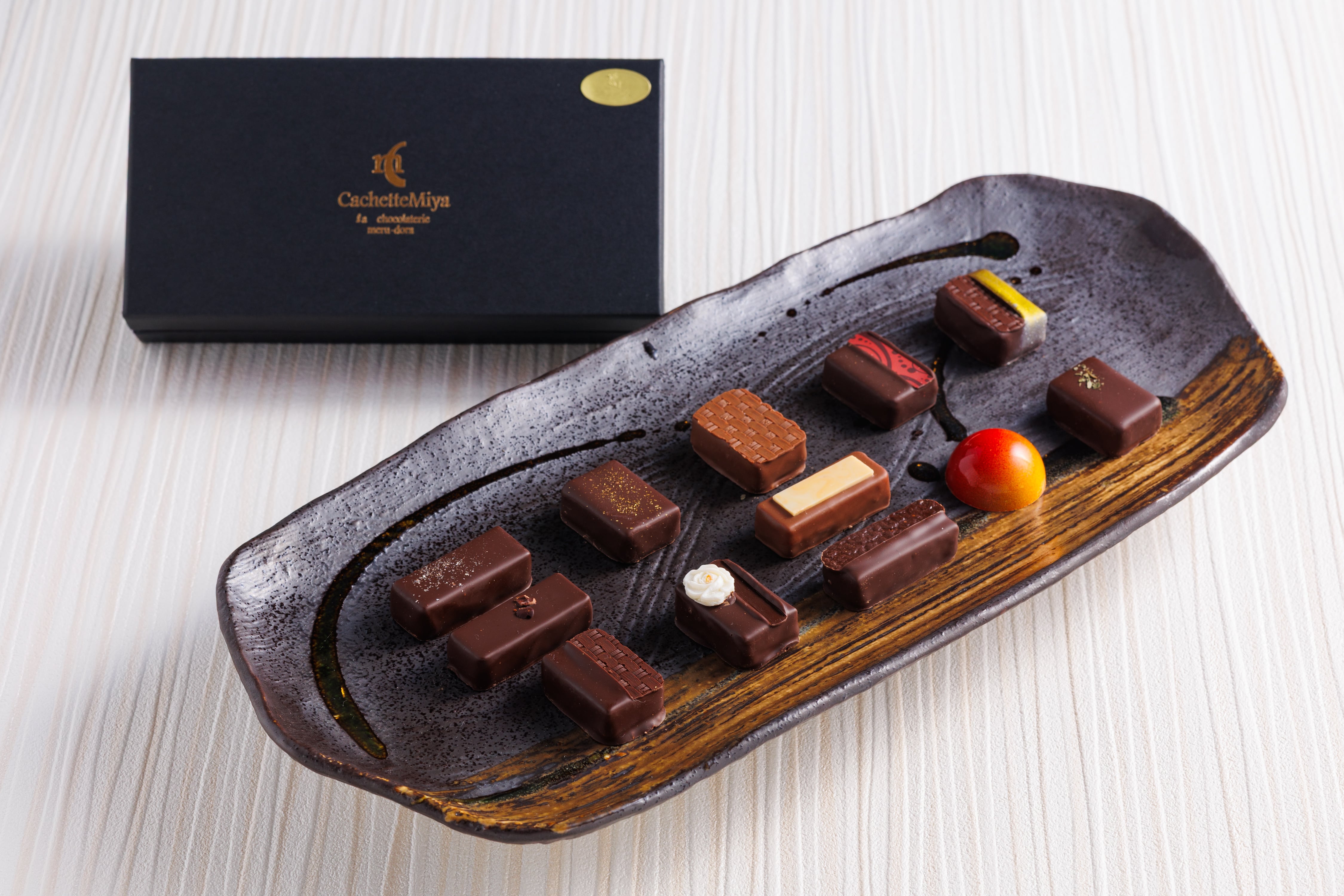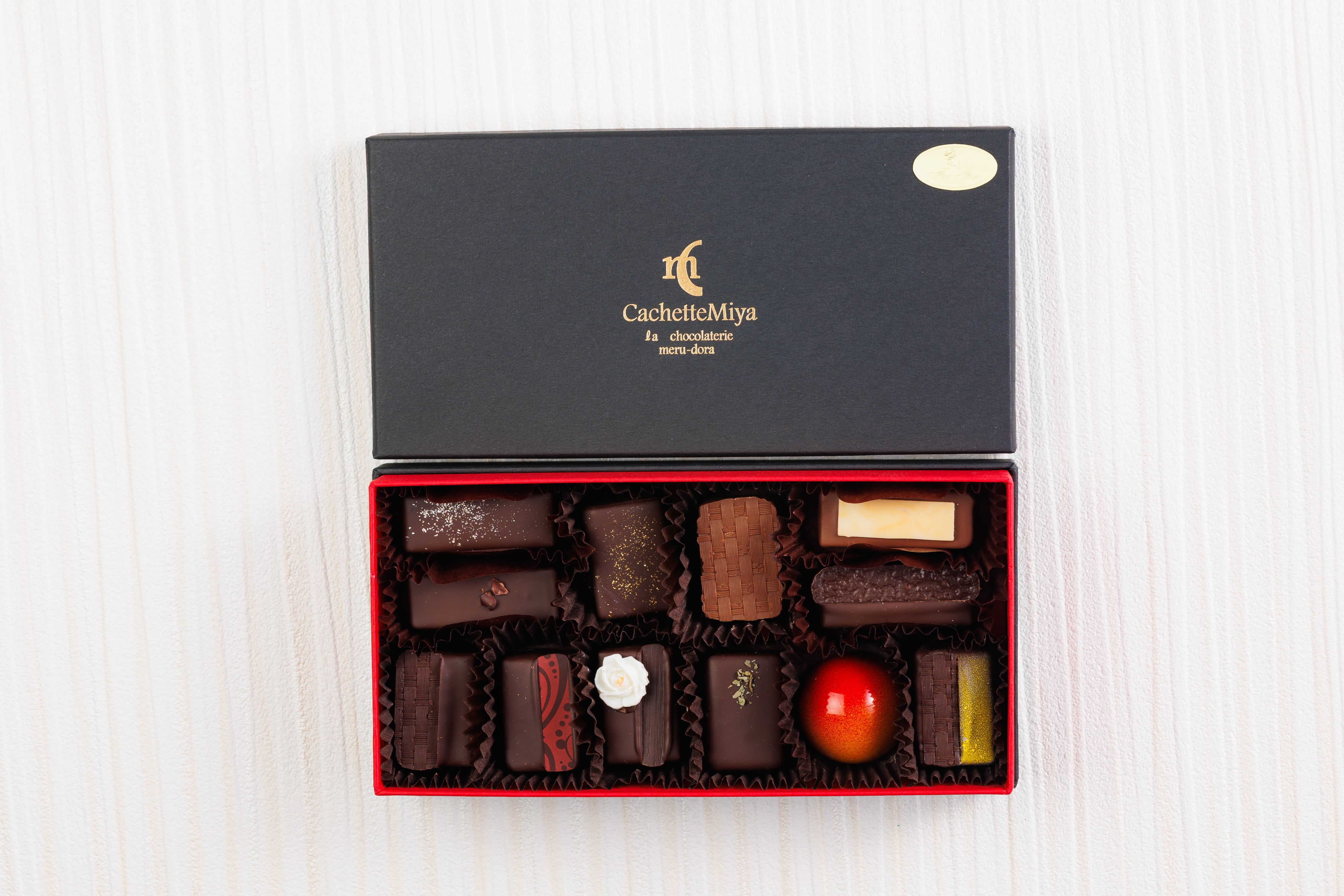 ナッツやフルーツ、キャラメルなど様々なフレーバーが楽しめる華やかな12粒BOX。